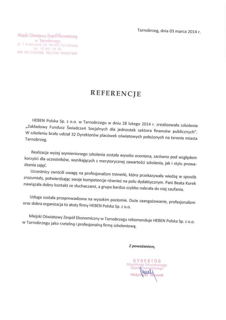 1. REFERENCJE Zespół Szkół Ekonomicznych w Sandomierzu2. REFERENCJE Urząd Miasta w Tarnobrzegu3. REFERENCJE Centrum Opieki nad Dzieckiem w Skopaniu4. REFERENCJE Miejski Oświatowy Zespół Ekonomiczny w Tarnobrzegu5. REFERENCJE Zespół Obsługi Szkół w Sędziszowie Młp.
