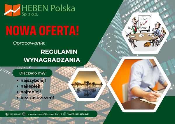 Firma HEBEN Polska Sp. z o.o. ma przyjemność zaproponować Państwu nową usługę: „OPRACOWANIE REGULAMINU WYNAGRADZANIA”.