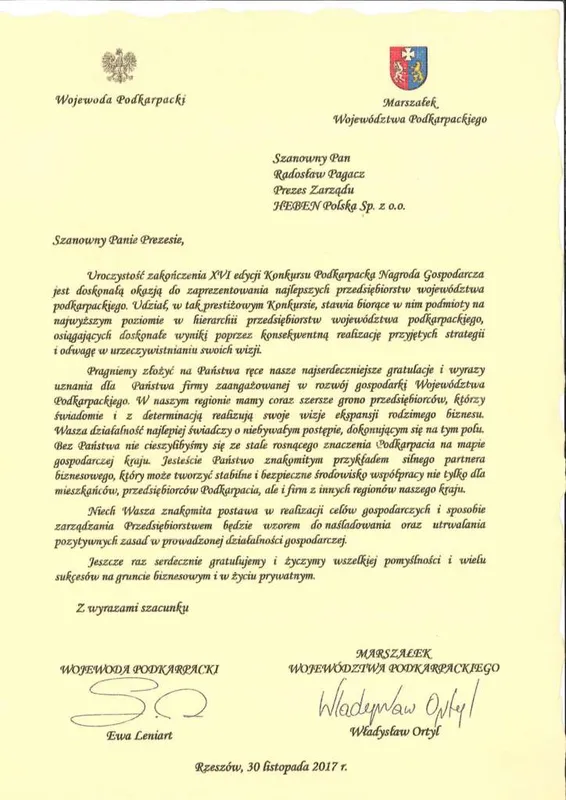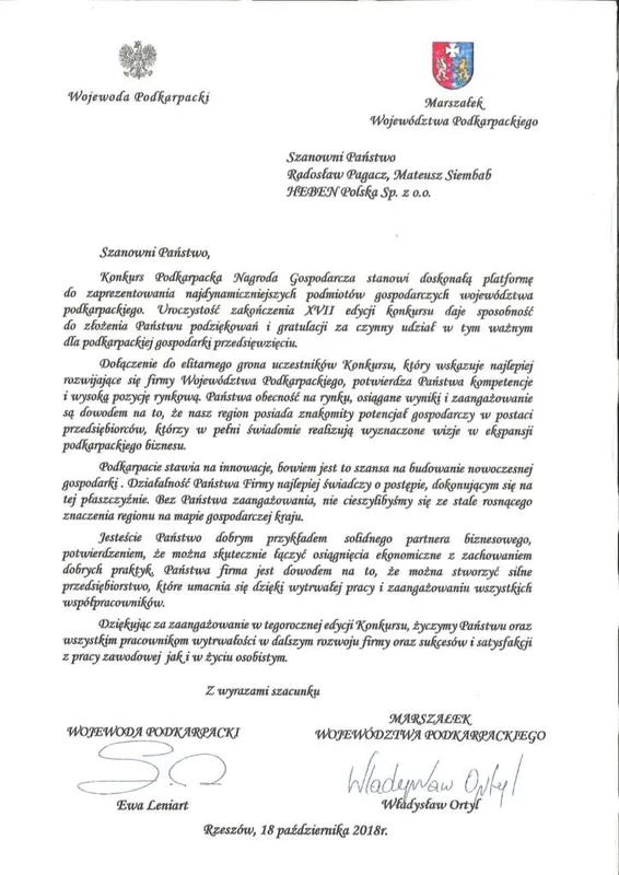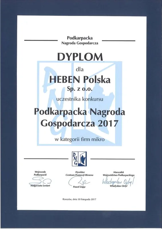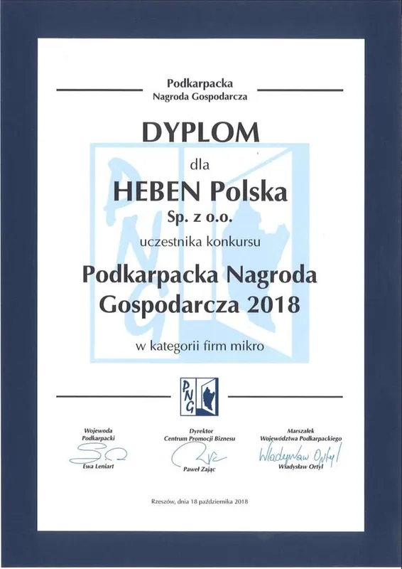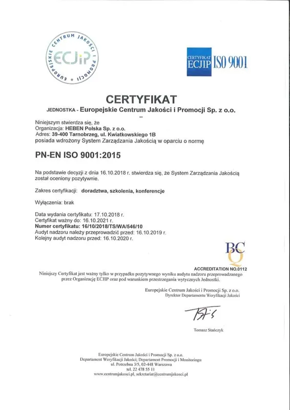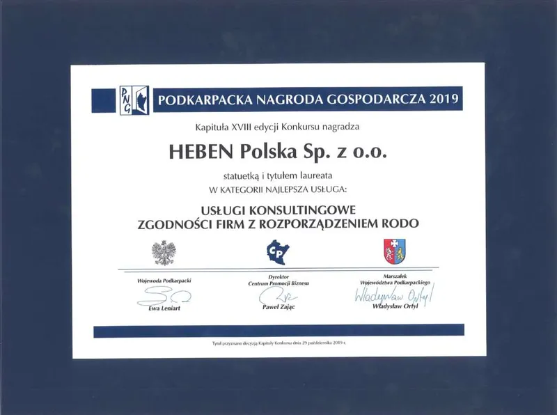 Posiadamy Certyfikat ISO 9001:2015 w zakresie doradztwa, szkoleń i konferencji oraz jesteśmy laureatami Podkarpackiej Nagrody Gospodarczej w kategorii Najlepsza usługa: Usługi konsultingowe zgodności firm z rozporządzeniem RODO w 2018 r. oraz Konsulting w zakresie BHP i PPOŻ. w 2020 r.